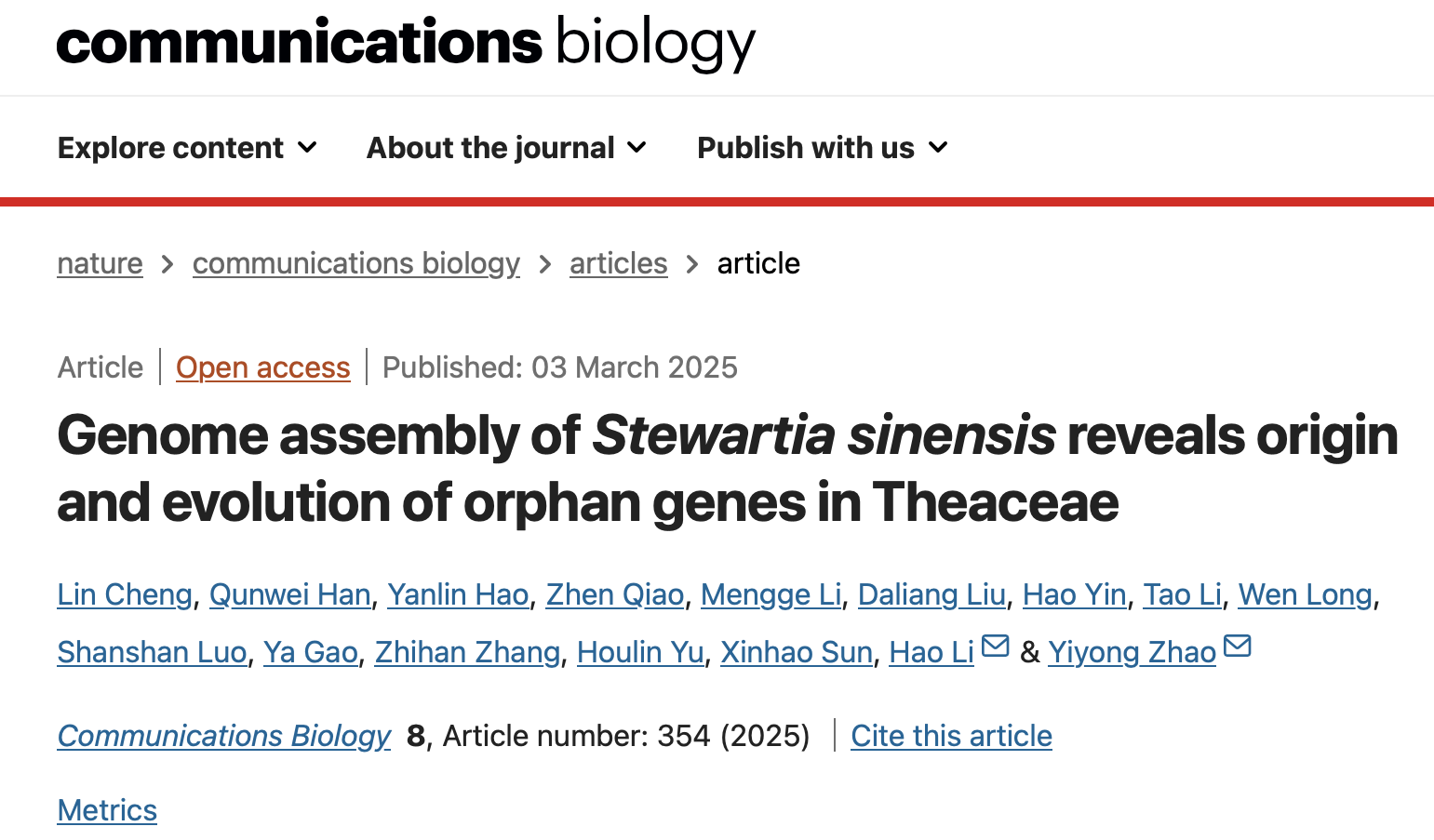 近日,春宫图 程琳教授团队联合贵州大学赵义勇团队、华东师范大学李浩团队于2025年3月4日在国际著名期刊《Communications Biology》(中科院1区TOP,Nature子刊,IF=5.2)在线发表题为“Genome assembly of Stewartia sinensis reveals origin and evolution of orphan genes in Theaceae”的研究论文。